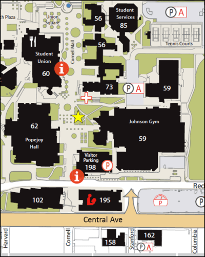 The yellow star shows the market location. Join us Wednesdays, from 10am-2pm on the Cornell Mall. There will be ten vendors in the grassy triangle just west of Johnson Gym.