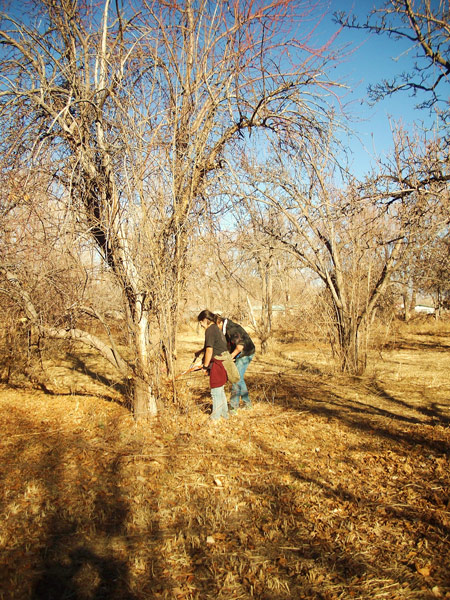 After what is quite possibly the longest city bus ride of my life and a short walk later, I am in front of the little yellow house with the big tree and the chain-link gate. It’s a cool but sunny day, and storms mill around the edges of the Rio Grande valley like cattle. Though I’m still in the city, the neighborhood feels like a rural village with its big yards full of old cottonwoods and acequia canals. The fences and stables and mailboxes have all seen several decades since they were new, but the area feels quietly alive. I’m here to meet with Amanda Rich of Erda Gardens and to join in whatever is happening in the orchard they take care of. I see some people working in the orchard behind the yellow house, and I step through the gate to go meet them.