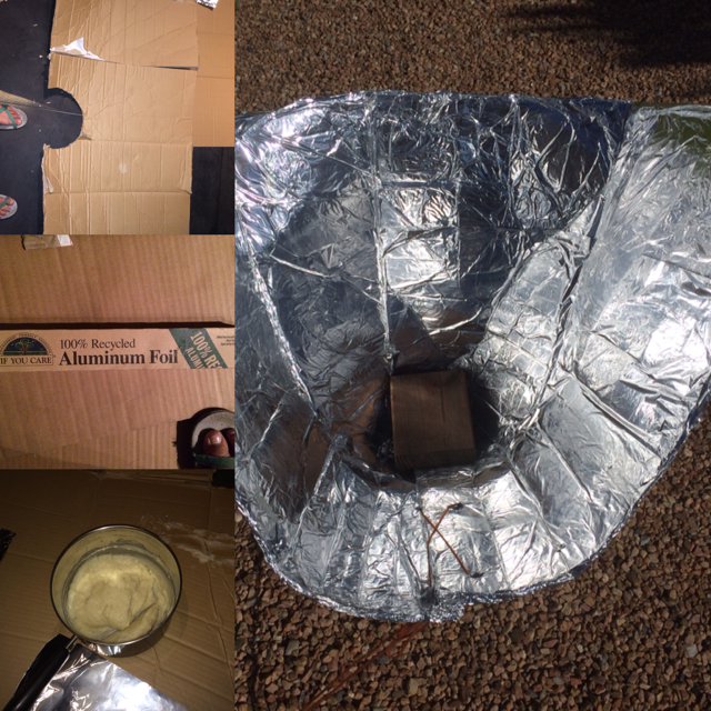 The solar funnel cooker is a very simple design; these guidelines give you all the information you need. What I used for my solar funnel cooker was a box that was roughly 2 feet by 4 feet when flattened, recycled aluminum foil, wheat paste, yarn, and a small wooden square for insulation.