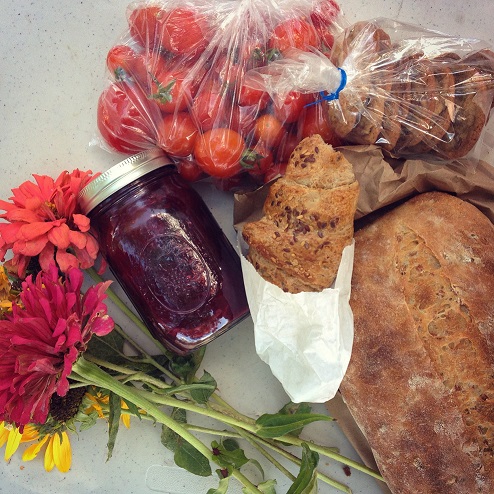 Pictured here are some beautiful flowers and fresh tomatoes from Arretche Farms, freshly baked croissants from Le Paris French Bakery, chocolate-chip cookies from Cookie Carry Out, and bread from Kuma, and a blackberry preserve from Cornelio Candelaria Organics.
