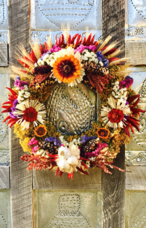 Look below to watch a time-lapse video of me making this wreath from harvesting the jaras (willow), to making the wreath base and adding the snakeweed and creating the look that calls out in celebration of the colors, beauty and bounty of Northern New Mexico agriculture.