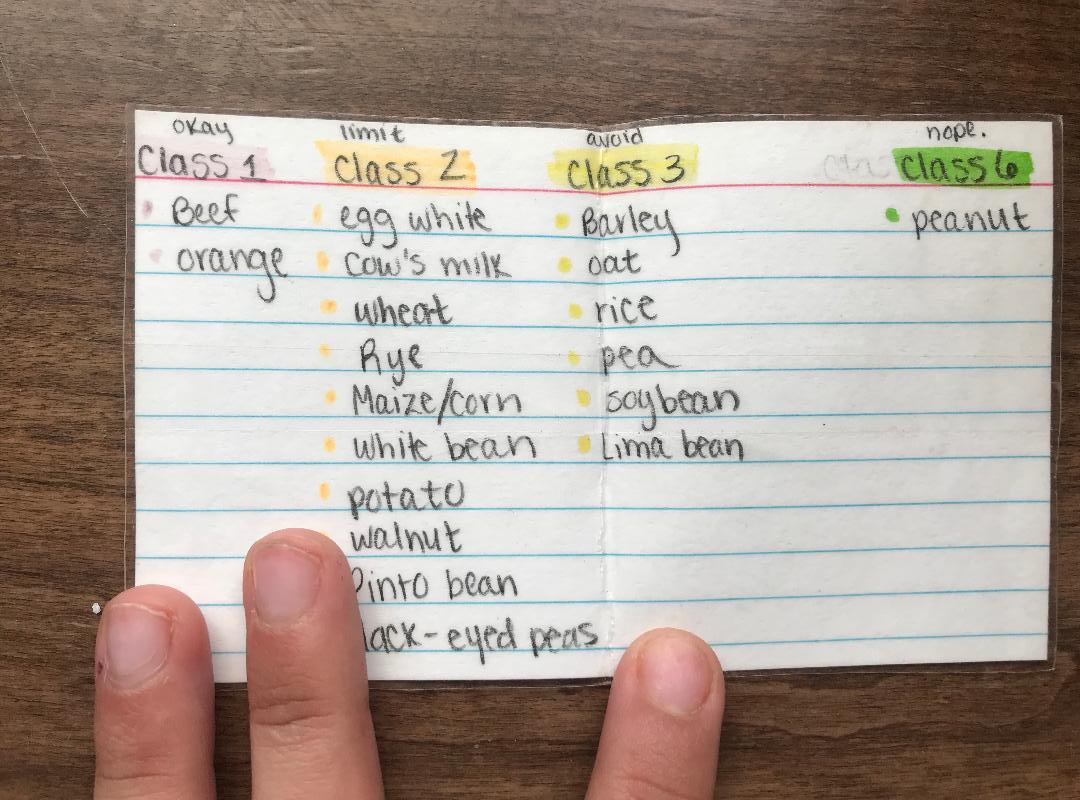 My allergy card that I would present to servers at restaurants. Each class indicates the severity of each allergy. Photo by author.