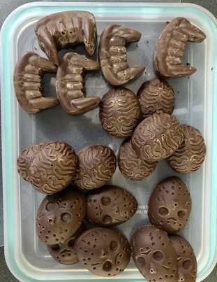 Shaped chocolates made from Chocolate Cartel’s Organic Dark Chocolate purchased from the La Montanita Co-op in Nob Hill. I cut the chocolate bar into chunks, added a teaspoon of coconut oil, and microwaved for 30 second intervals until melted. I poured the melted chocolate into shaped silicone molds and removed when dried. Photo by author.