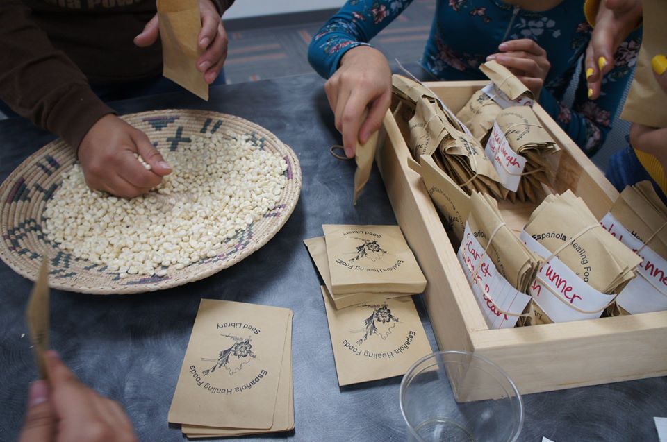 Youth organizing seed packets for the opening of the Espanola Healing Foods Oasis seed library. Photo credit: Emilt Arasim