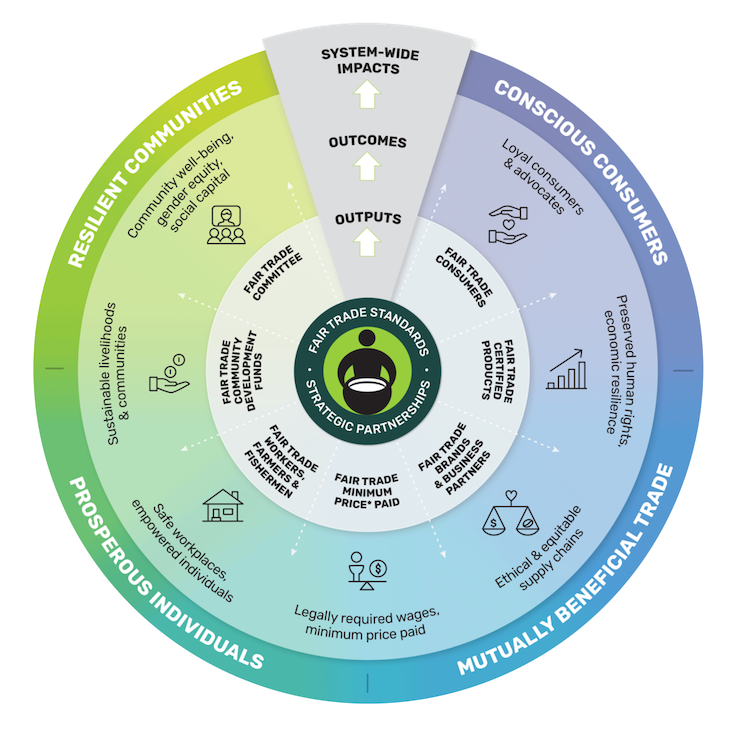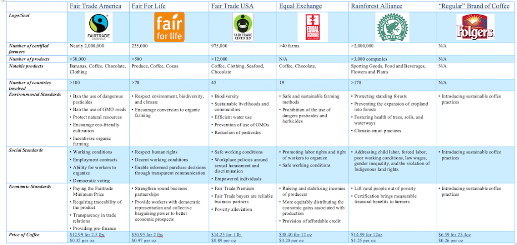 The table above outlines some of the various aspects that are important when considering fair trade labels. The labels range in size from 40 farms to over 2,000,000 million farms. The products included in each fair trade label are relatively the same. Additionally, the types of standards and practices instituted in each label are more or less the same, which makes it even harder to determine which label is the “best,” This “Theory of Change” graphic from Fair Trade Certified provides a great summary: