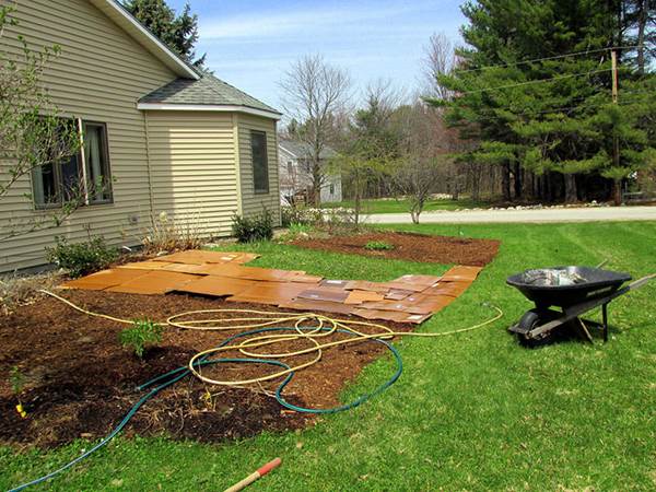 Lasagna gardening/ Smothering– This method involves putting newspaper or cardboard over the grass to smother it.
