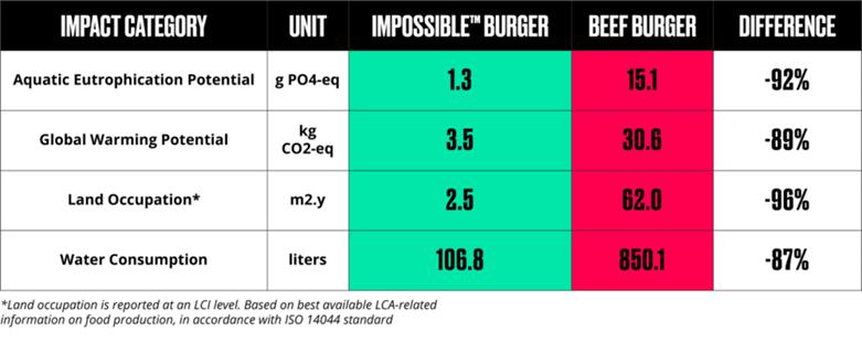 Since impossible meat is made entirely from plants, the environmental impact is less, compared to meat production. Meat production uses more land, water, and recourses than crop farming. According to the United Nations for climate change (UNFCC), “compared to beef, the Impossible Burger required 96% less land, 87% less fresh water, generated 89% less greenhouse gas emissions and resulted in 92% less pollution to freshwater ecosystems”. It was also stated that in 2018, Impossible Burger sales of beef spared the equivalent of 81,000 tones of greenhouse gas emissions, 3.4 billion liters of water and 100 square kilometers of land. From the impossible company they have conducted their own environmental impact report with Quantis. The UNFCC uses the information and stats from these reports since it is the only source of information provided for the impact of the Impossible Company.