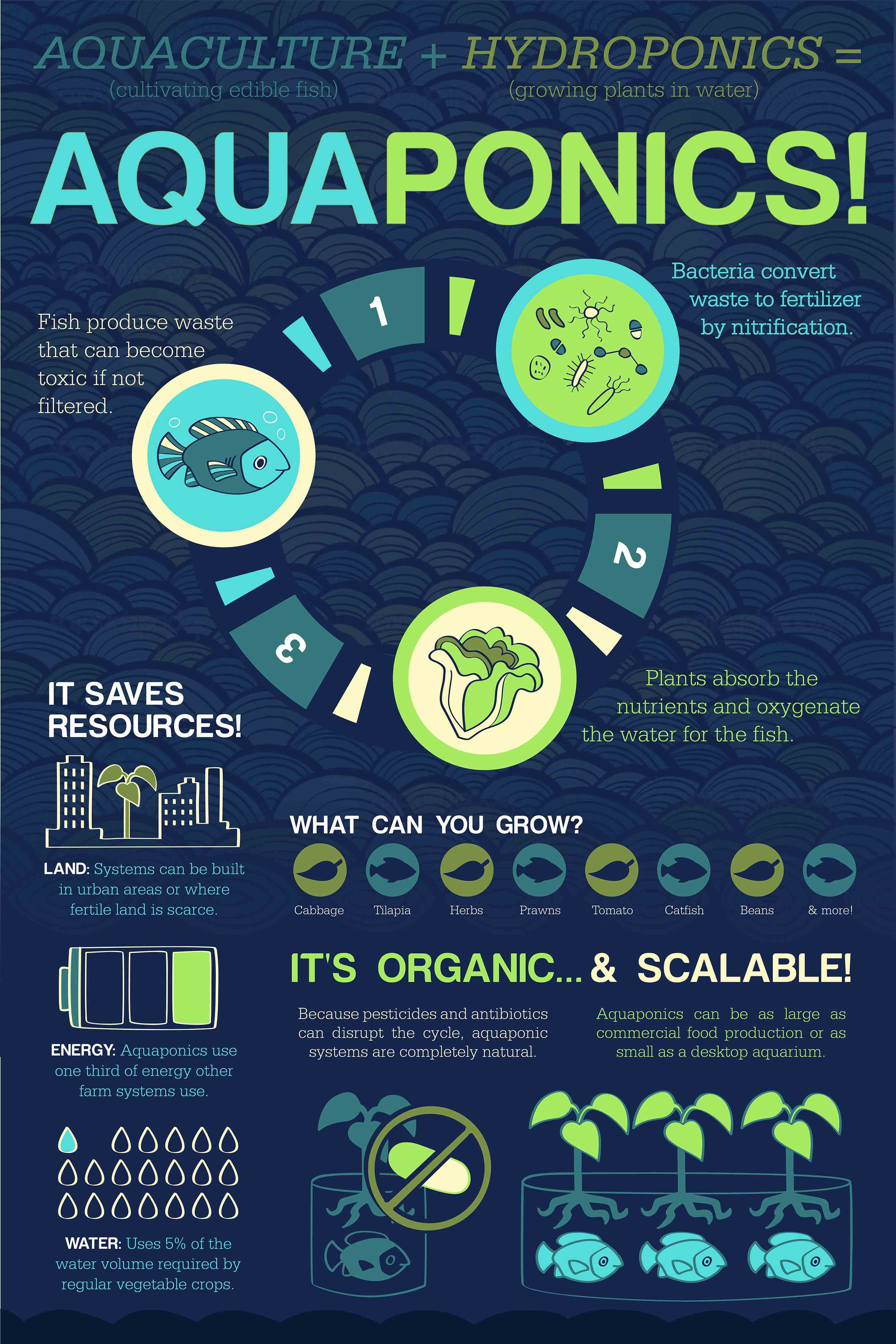 While hydroponics is a more efficient growing method than traditional agriculture, we are seeing New Mexicans embrace a different style of growing as well. One example is the students at Santa Fe Community College who are using aquaponics to grow their food. Aquaponics is the combination of traditional fish farming and hydroponics in which the goal is to grow plants and fish at the same time. The main advantage of this method is that it allows the nutrients produced by fish waste to be used by the plants, which in turn help filter the water making it suitable for fish. In comparison to hydroponics, this requires less water quality monitoring and is less prone to disease.