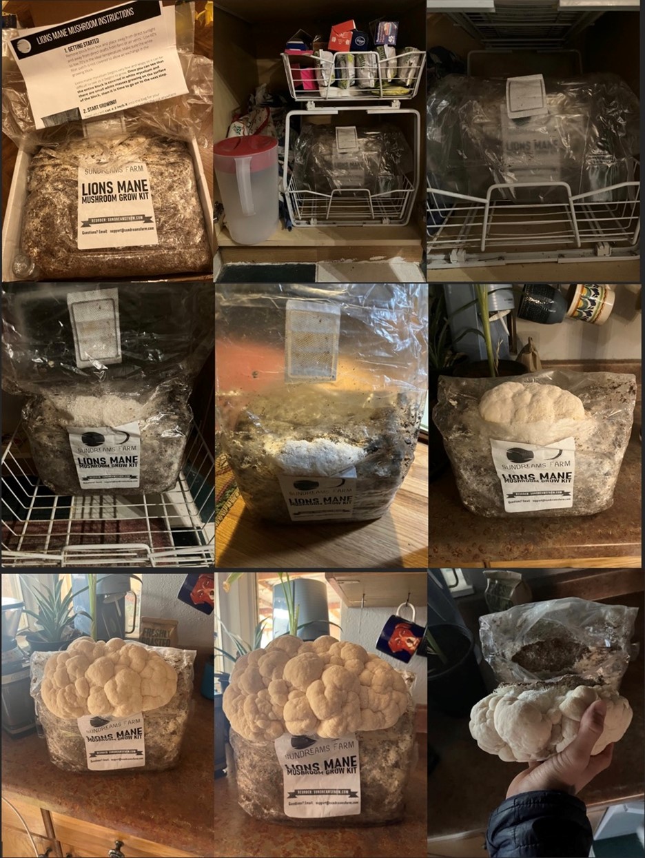 My experience growing Lions mane mushrooms with a kit from Sun Dreams Farms was incredibly easy, satisfying, and delicious. The block arrived with a well-developed mycelium network, so I was able to harvest my first mushroom within 11 days of receiving the kit! See below for some photos documenting the experience.