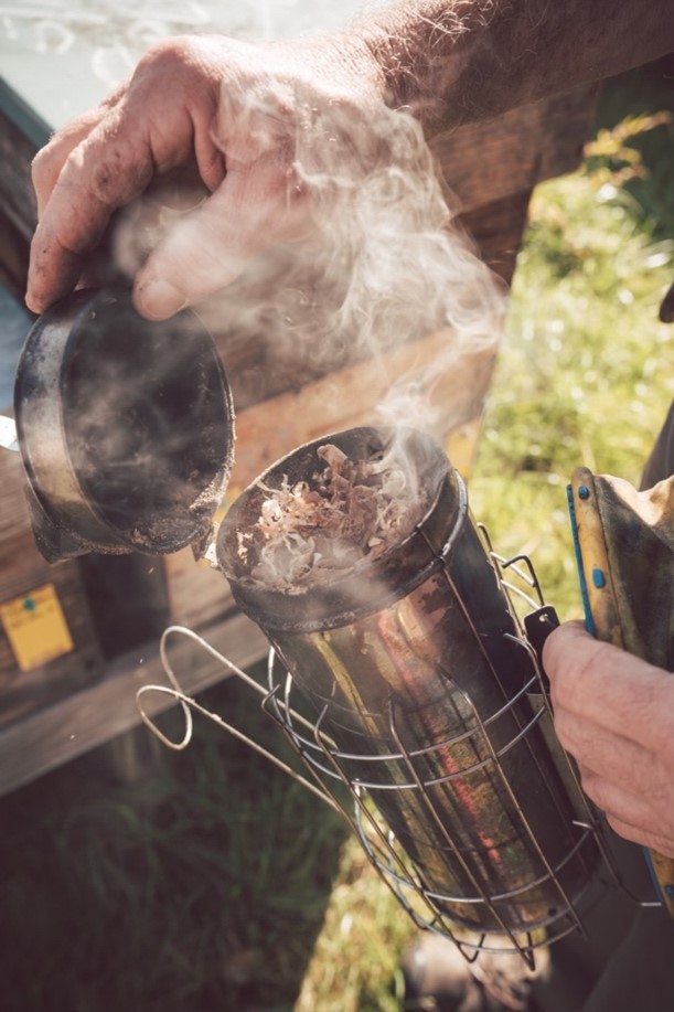 Martin fills his smoker with the traditional wood shavings and newspaper plus a little sprinkle of incense, his own special addition. The smoke works to calm Martin as much as it does the bees and allows him to enter a peaceful headspace. With the smoke wafting around him, Martin begins lifting the lids of the hives and entering the world of the bees.