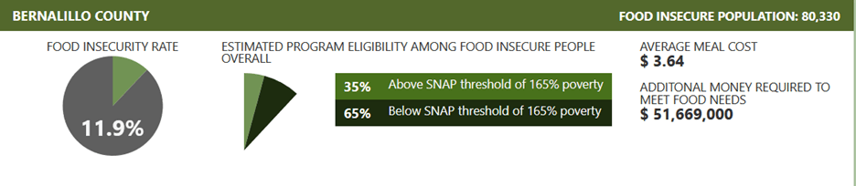 In November 2023 New Mexico was allotted just over 82 million dollars to fund SNAP for the month-long period. These benefits went to 333,000 homes. Farm bills have steadily increased the funding for this program every four years when the bill is up for reevaluation yet, it is still not enough. When looking at these numbers it can seem like these programs are fully funded. Yet, in Bernalillo County (most populous county in New Mexico) the number of food insecure people is high and of this number a significant amount are unable to access SNAP funds due to too high of income, too many assets, or various other reasons.